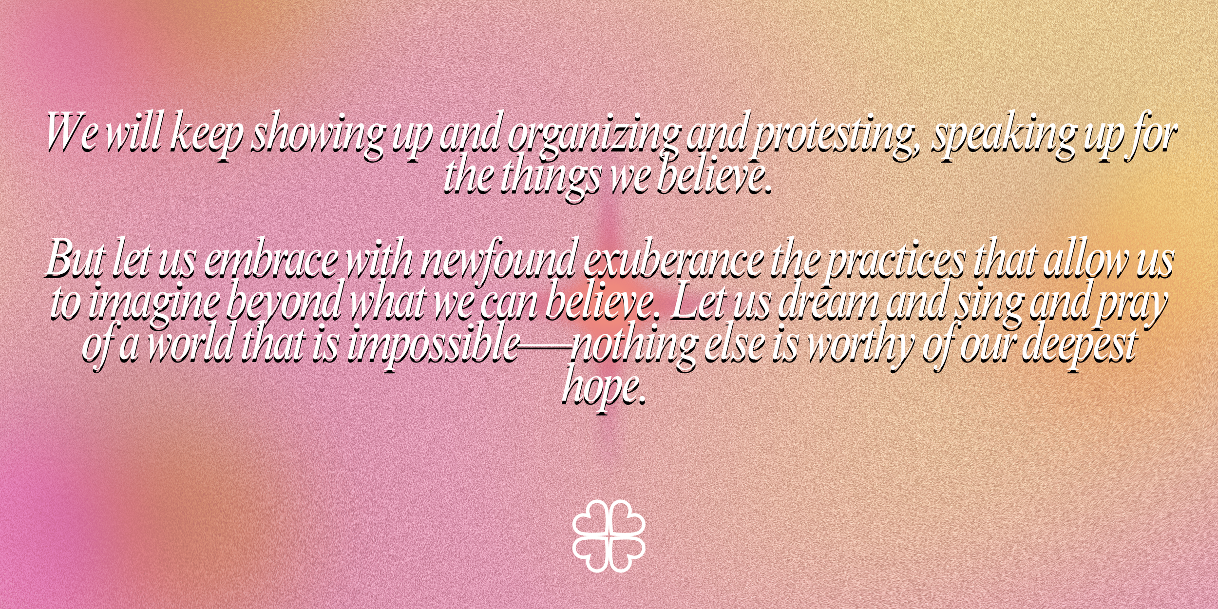 But let us embrace with newfound exuberance the practices that allow us to imagine beyond what we can believe. Let us dream and sing and pray of a world that is impossible—nothing else is worthy of our deepest hope.